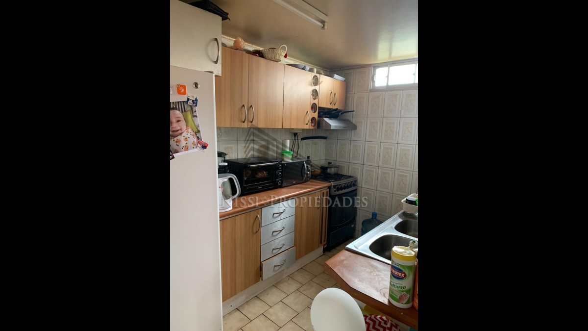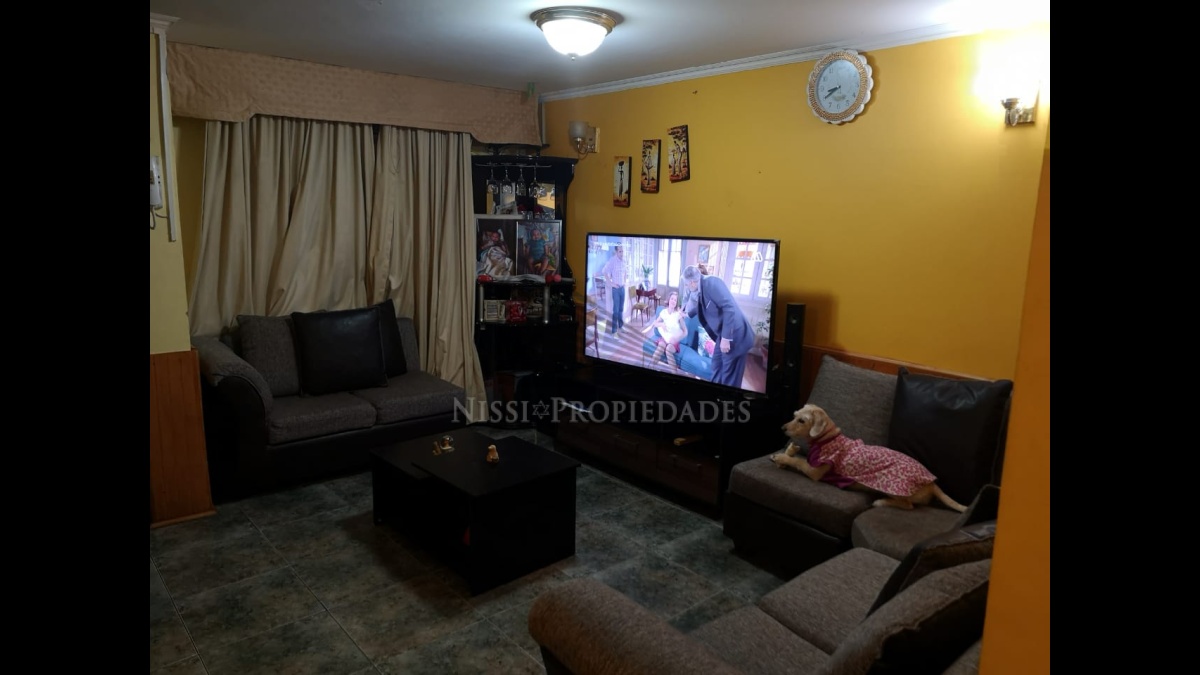 Estacionamiento grande, antejardin, baño visitas, pequeña bodega bajo la escalera, living, comedor, 1era habitación (cabe cama 1 1/2 plaza), cocina equipada.