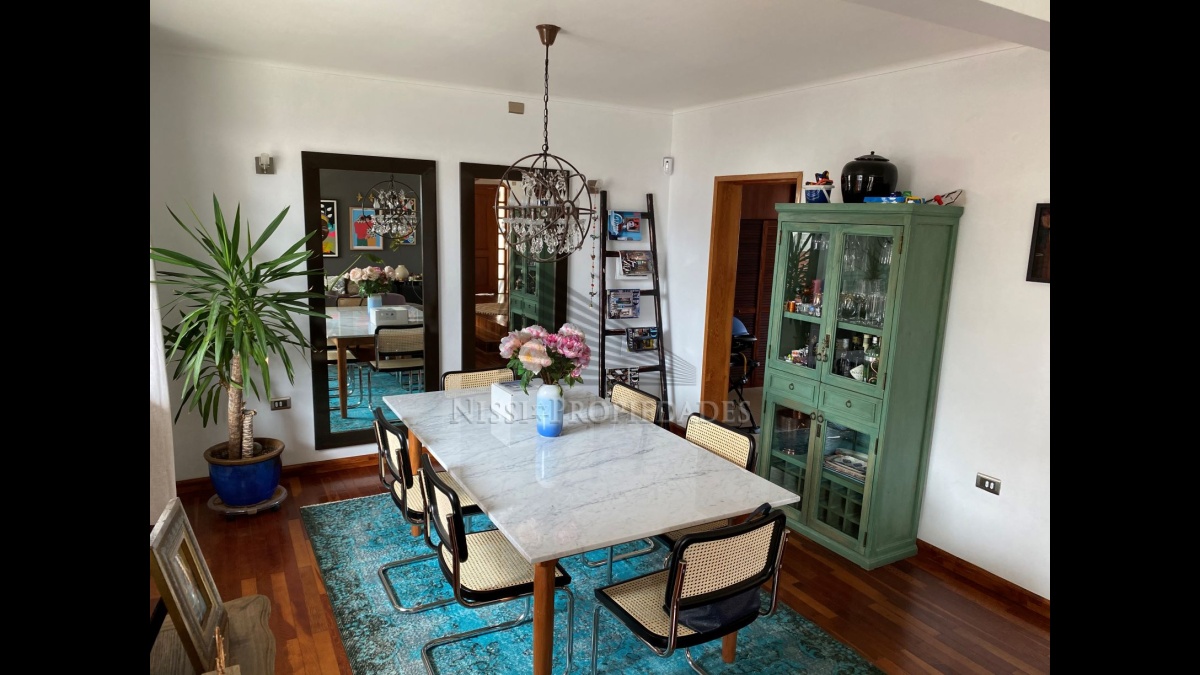 EXTERIOR: Jardín con riego automático para césped, arbustos, flores y palmeras, Terrazas en Pino Oregón y policarbonato, Pisos en cerámicas provenzal, Estacionamiento Techado con portero automático y muebles para bodega en melamina, patio de luz para actividades propias del servicio. Piscina de 6,5 x 3,5 mts. con sistema Jacuzzi y rejas protección para niños, calefacción solar por serpentines, iluminación led colores. Camarín, Quincho completamente techado en Pino Oregón y equipado con Bar, Muebles de almacenaje, Lavandino, Parrilla con ladrillos refractarios, Campana, Quemador de Gas, Horno de Barro Inoxidable, Muebles de Terraza en Ratán. Todo con instalaciones decorativas de luces y accesorios en combinación.