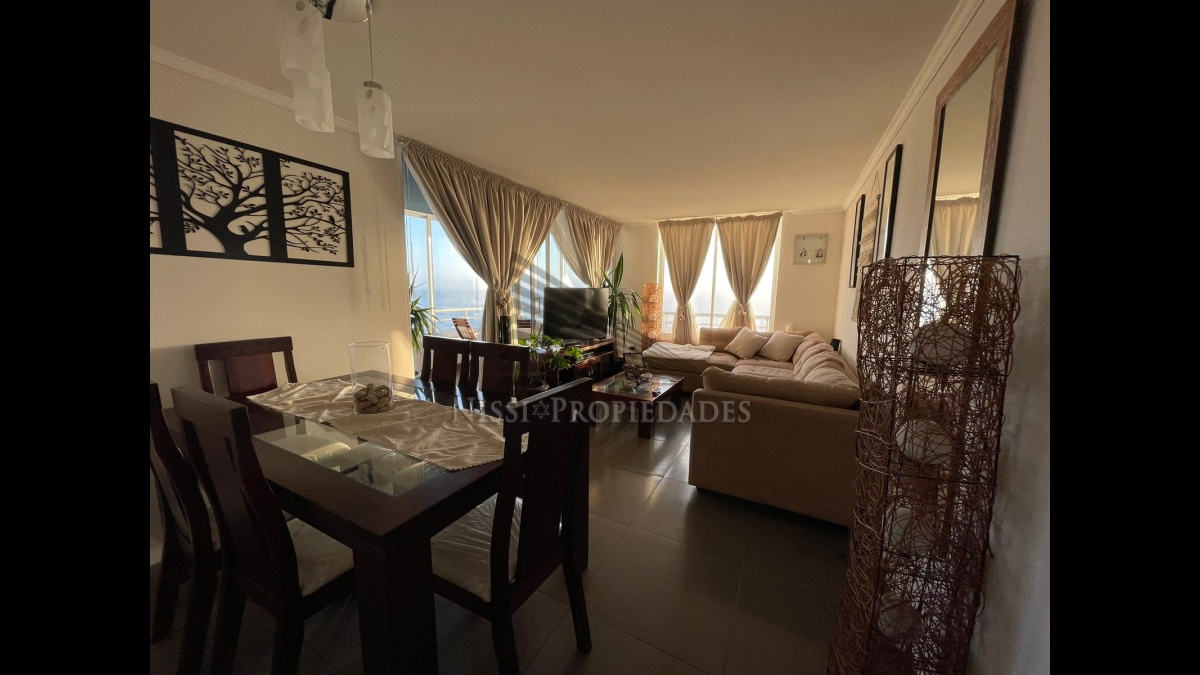Consta de 3 dormitorios, 2 baños y 1 estacionamiento. Semi amoblado o sin amoblar, ubicado en el piso 15 con terraza y vista al mar. Cuenta con cerrado de ventanales y malla de seguridad. El valor incluye los gastos comunes ($83.000 aproximadamente). El edificio cuenta con áreas comunes como piscina, quinchos, salón de eventos, gimnasio y conserjería 24/7.